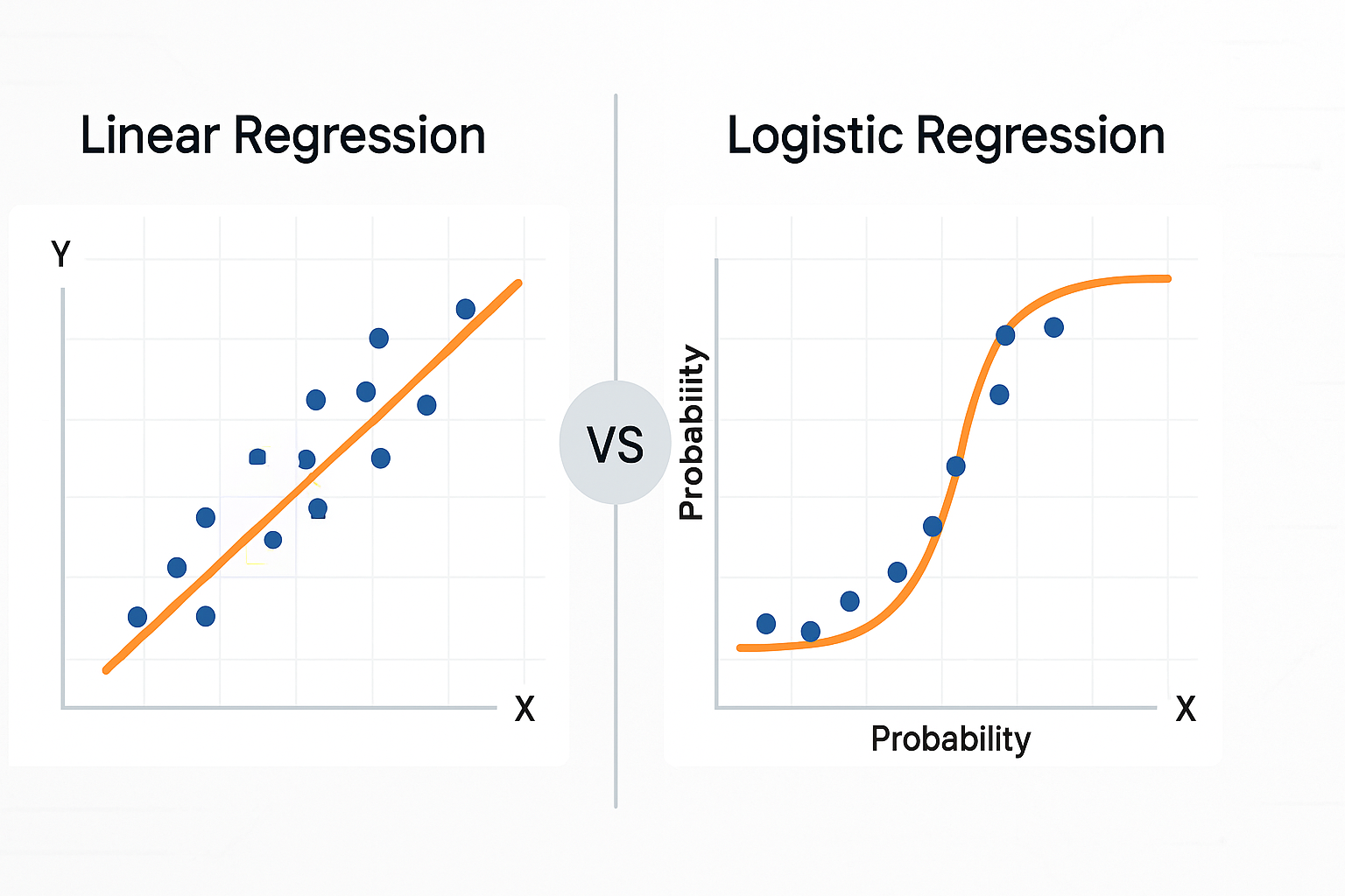 - Logistic Regression: Fits an S-shaped curve to predict a probability between 0 and 1.